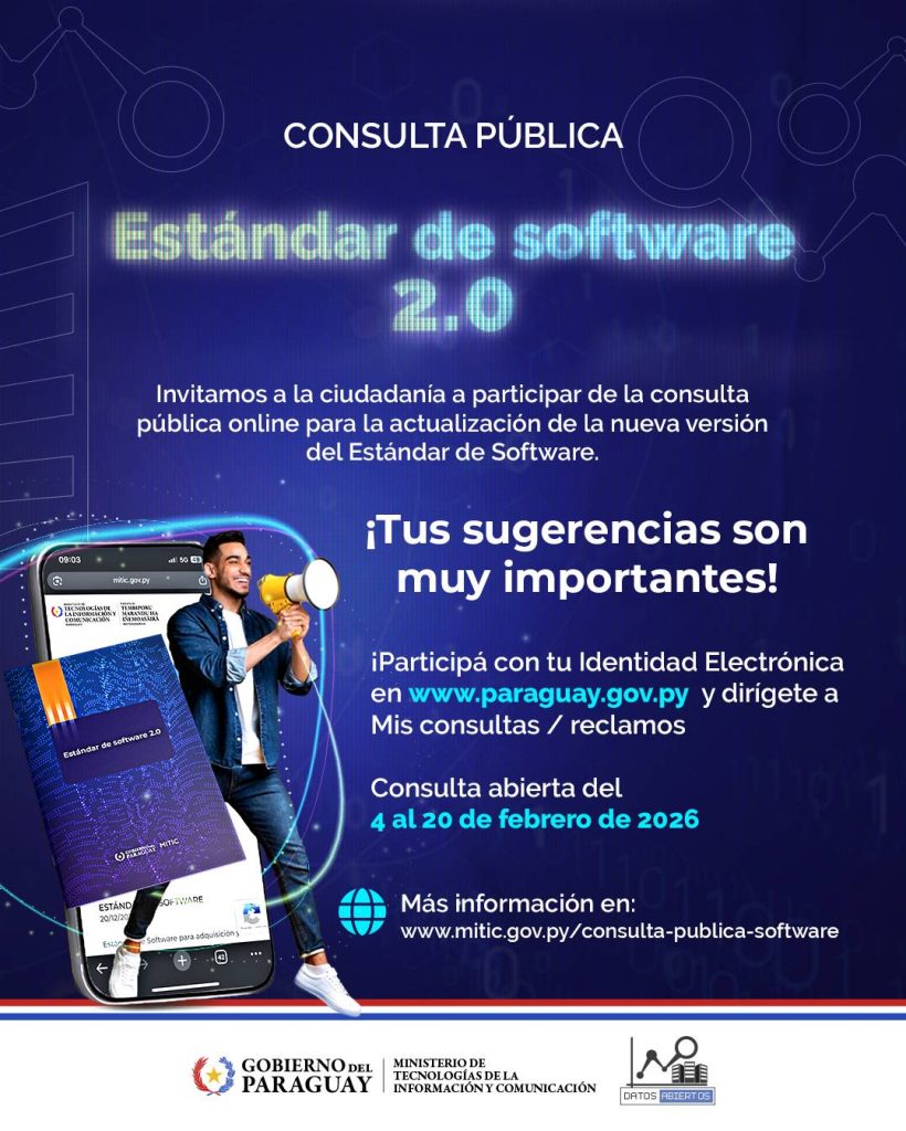 El Ministerio de Tecnologías de la Información y Comunicación (MITIC) invita cordialmente a la ciudadanía, empresas, proveedores en general y a las instituciones del Estado a participar de la consulta pública en línea de actualización del Estándar de Software – Versión 2.0.